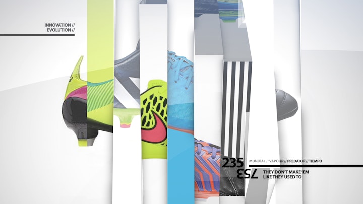 Influenced heavily by the vibrancy of modern-day football boots and the retro style of high-end football publications, the sequence took shape as an array of static based poster montages. These frames essentially because the backbone of the entire program redesign – a responsive, fact based title and studio with set panels to match.